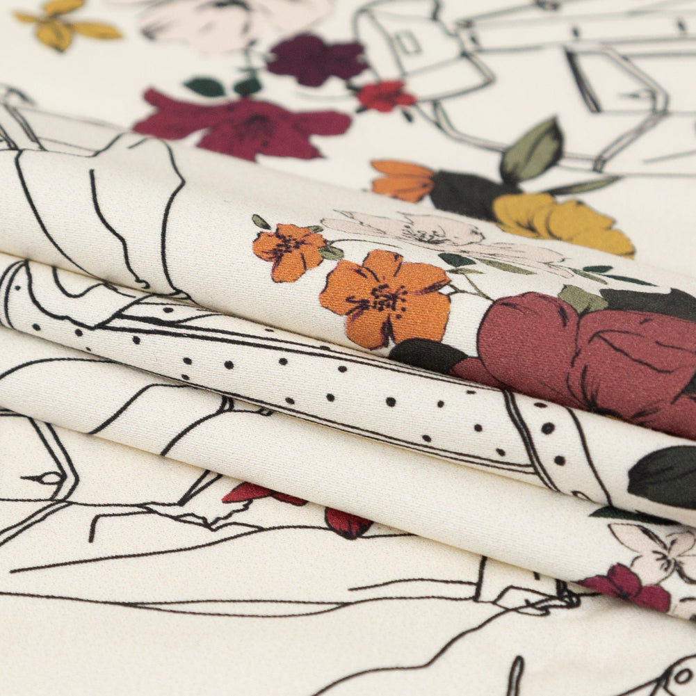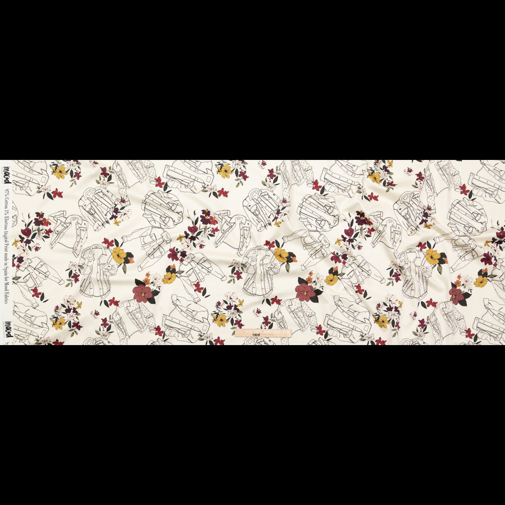 Illustrating the everlasting notion of beauty in time passing, our Mood Exclusive Winter White Mono No Aware Stretch Cotton Sateen compassionately delves into “the passage of things”. From the Mood Exclusive Kenko Collection: Crisp with a soft, gummy feel, this medium-weight wonder expresses a dull sheen across its digitally-printed facing. Animated as if being worn, relaxed denim jackets and be-dazzled bombers swirl around the ivory backdrop with lime-green and red-purple floral motifs pasted over, composing a surreal scene; and as “...the sight sinks deeply into one's being... one feels ‘Oh! for a friend with whom to share this!'”. And, who wouldn't want to share this gem? With its anti-static make-up, breathability, knack for drawing perspiration away from the body, and wrinkle-resistant surface, it is quite the dream! Specially constructed with a satin weave, twisted staple fibers combine with elastomeric fibers—producing a crosswise stretch of about 10%—while weft yarns floating over (at least four) warp yarns create a hint of luster and smooth surface, (overall similar to a twill weave without yielding a diagonal ridge). “...being pleasing to the eye and at the same time useful for all sorts of purposes…” translate this stunning beauty into countless silhouettes—taking inspiration from its semi-stiff, flexible drape (and the poetic writings of Yoshida Kenko!): Sew together body-hugging looks such as a blouse or sheath dress with a billowing peplum, high-waisted wide leg trousers, shirt dresses, and more! Also great for A-line garments, check out The Cypress Dress free sewing pattern (made from cotton sateen!) offered on our Mood Sewciety blog. Translucent especially when held under the light, consider introducing a lining for true opacity.